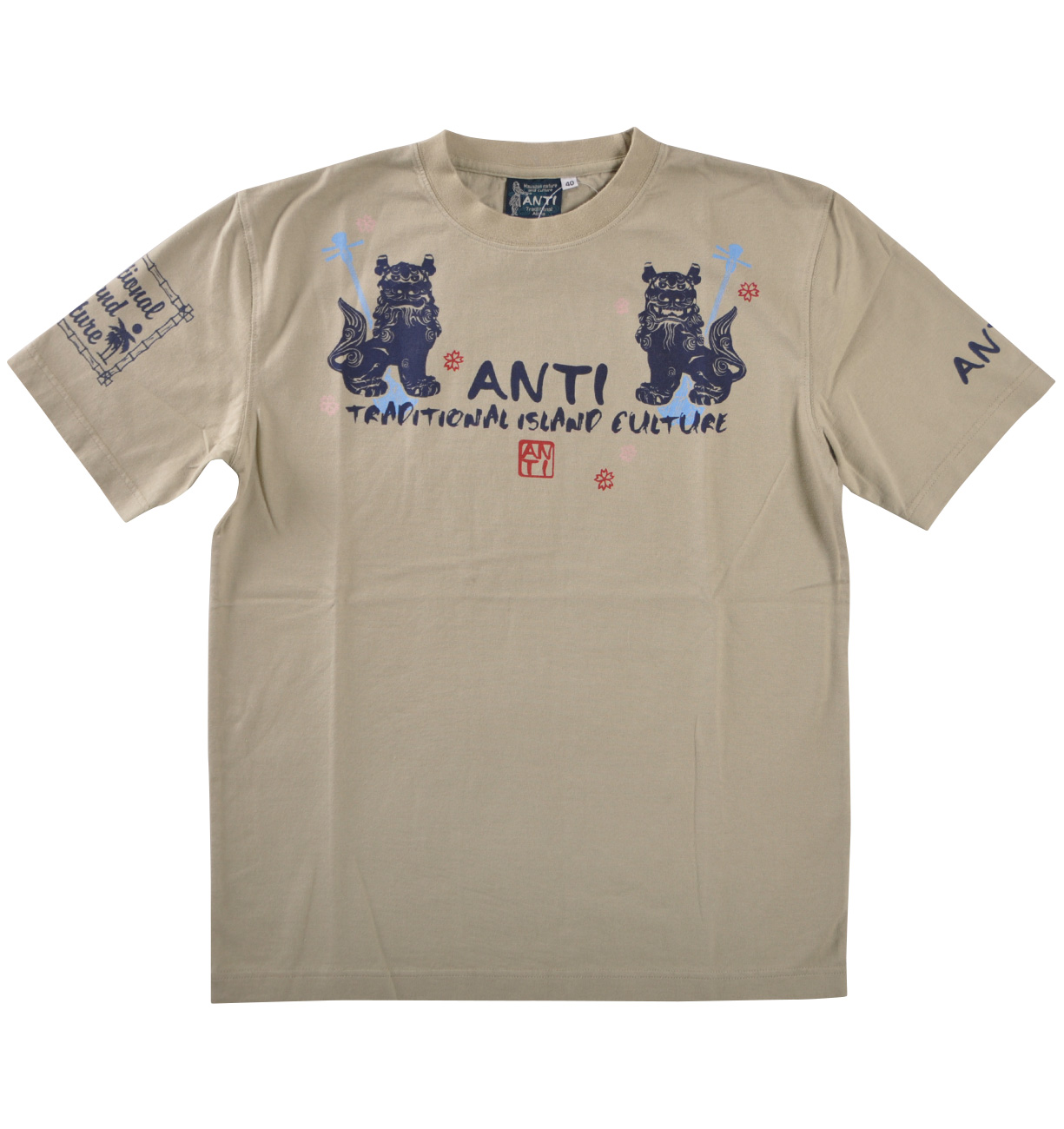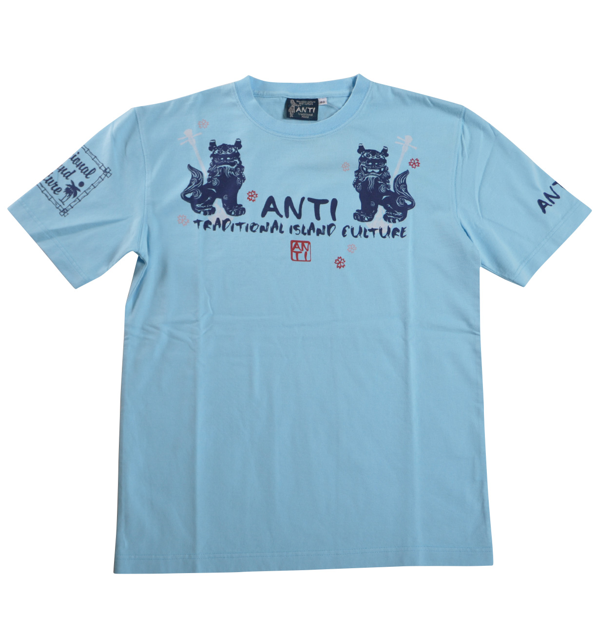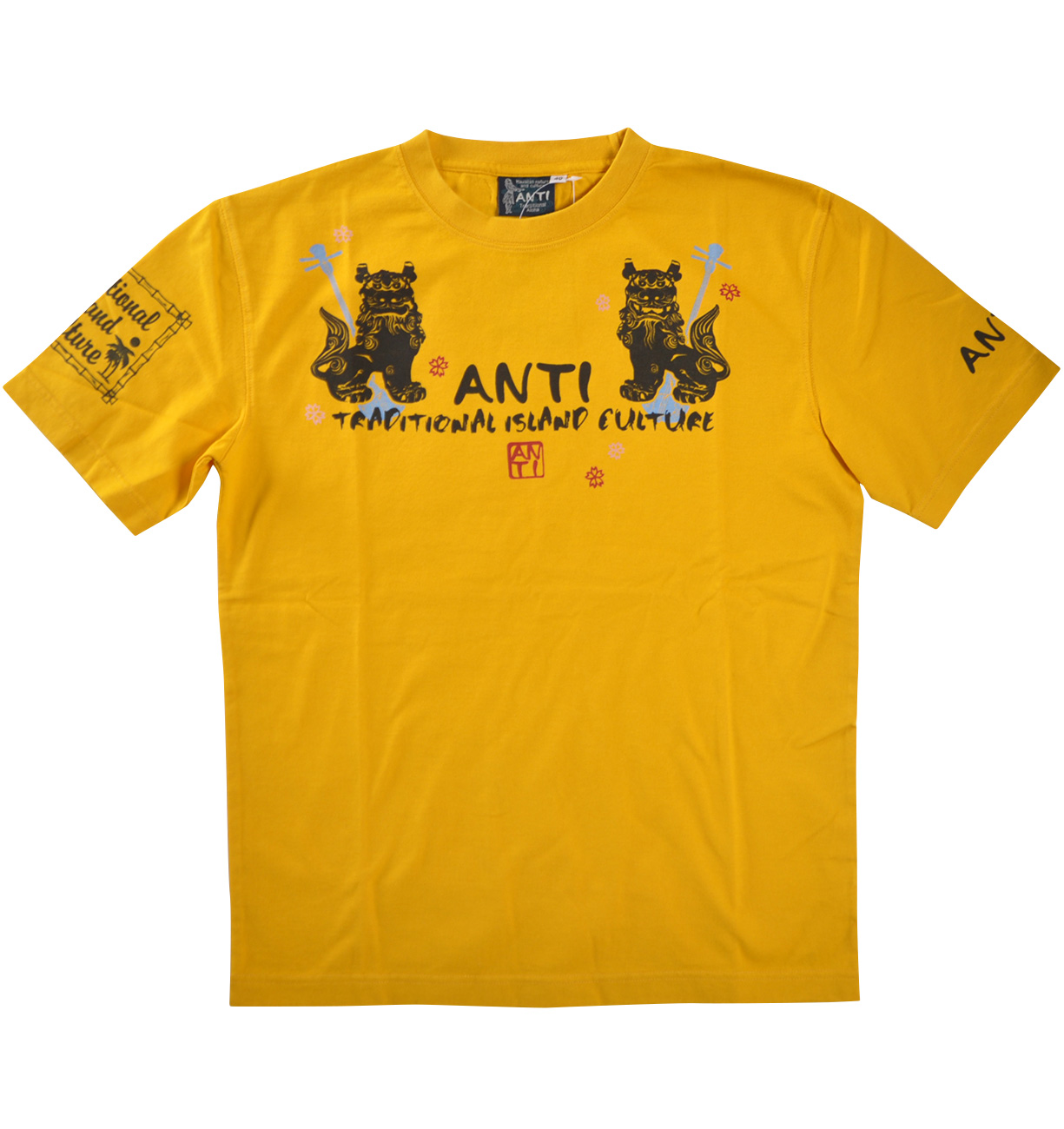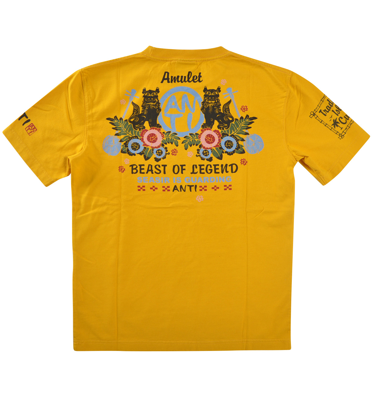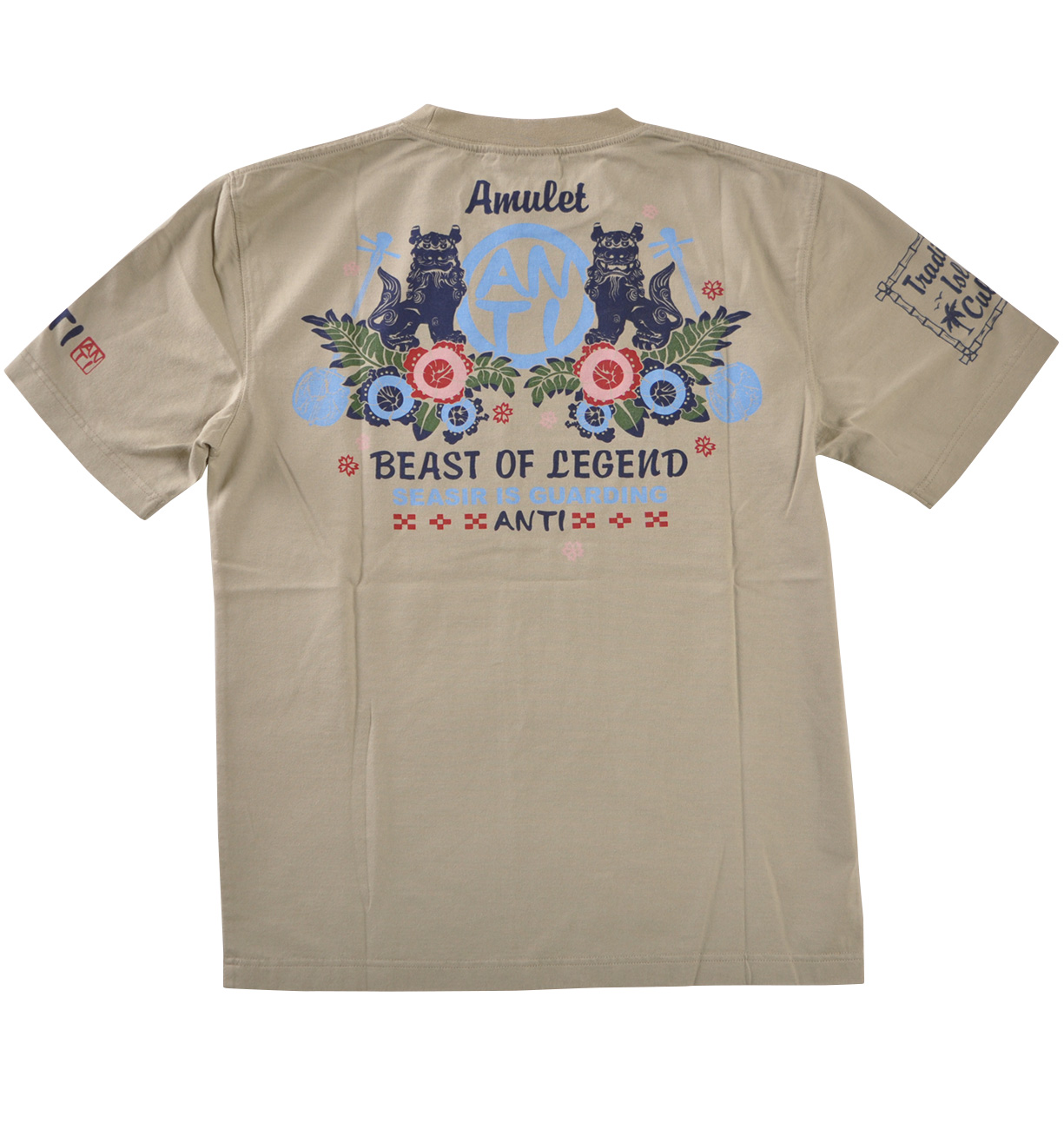 古来より悪霊を追い払う魔除けの意味を持つ伝説の獣、シーサー。そんなシーサーをモチーフにしたTシャツは南国らしい花の図案もあり華やかな雰囲気だ。本物はとても重いけど、コレなら簡単に災いからアナタをガード!