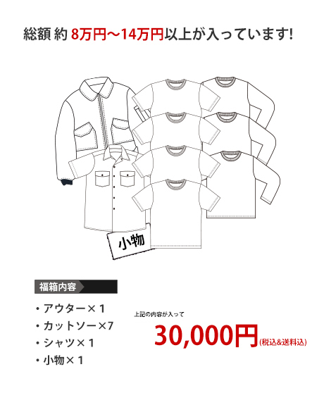 こっそり中身を教えちゃうと・・・アウターはミリタリー系ジャケット又はリバーシブルスカジャン!カットソーのアソートにシャツ系とコレクション小物!
