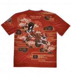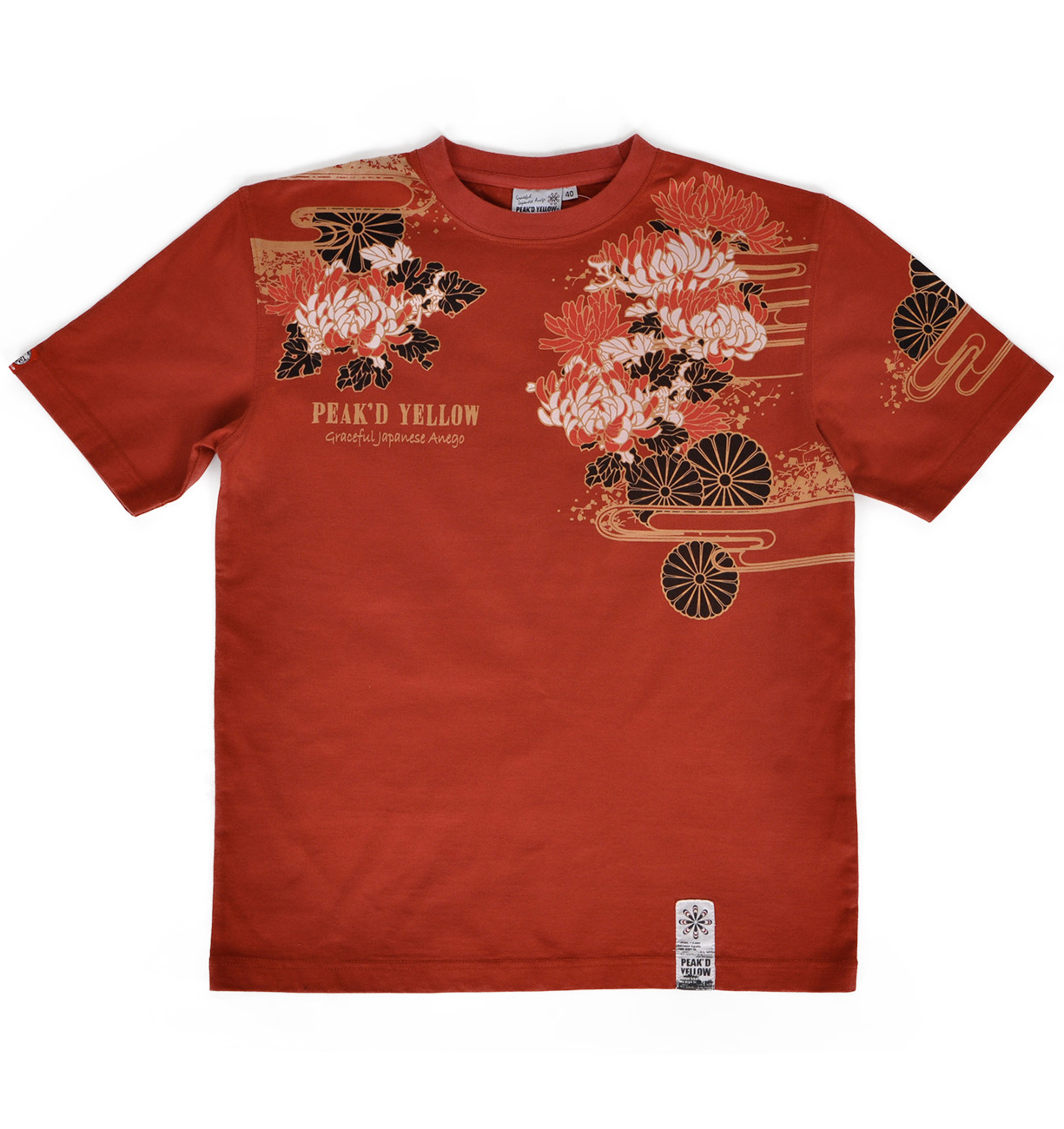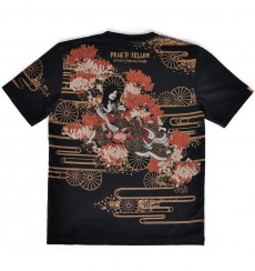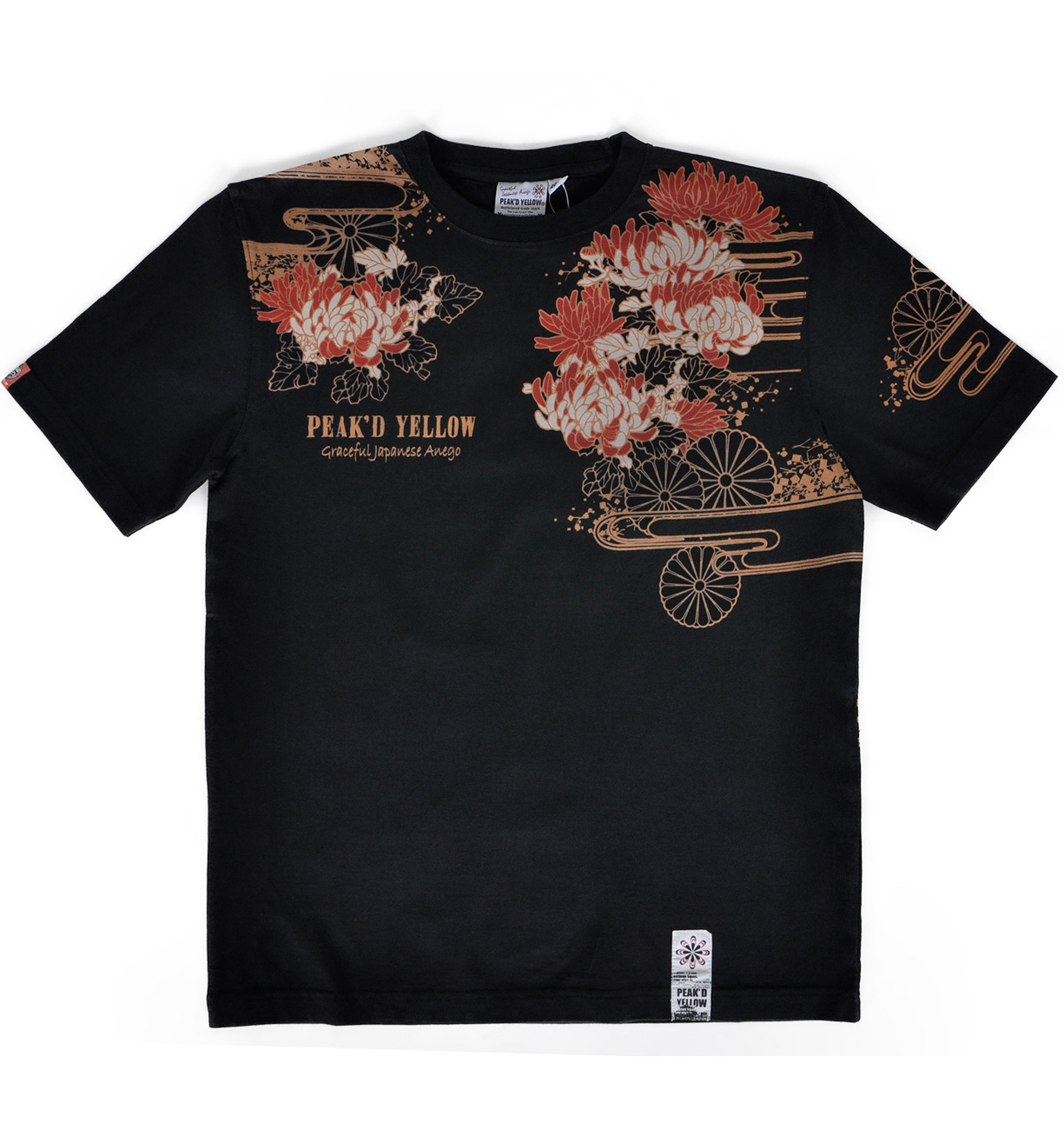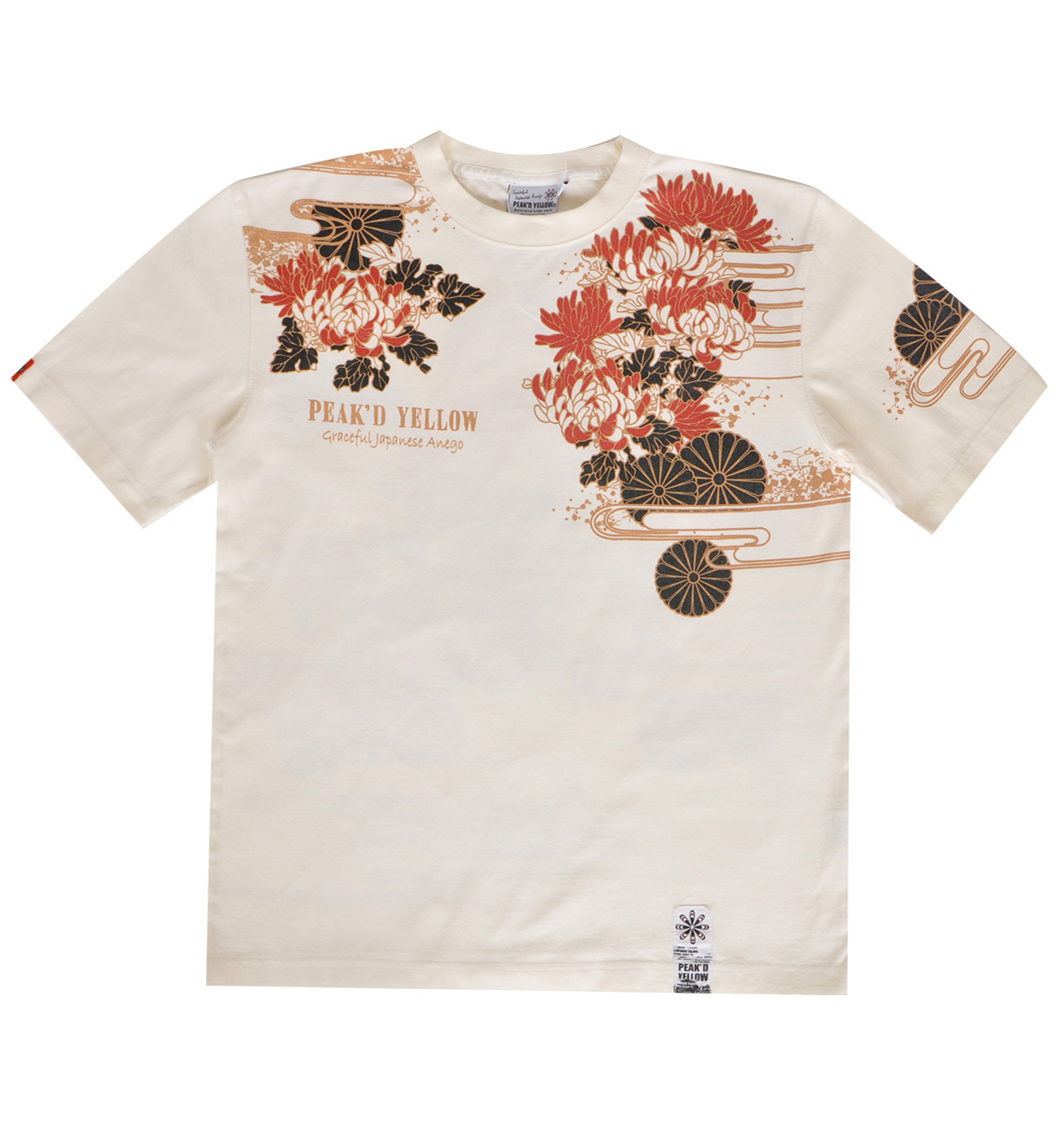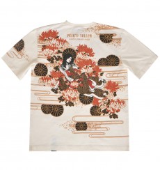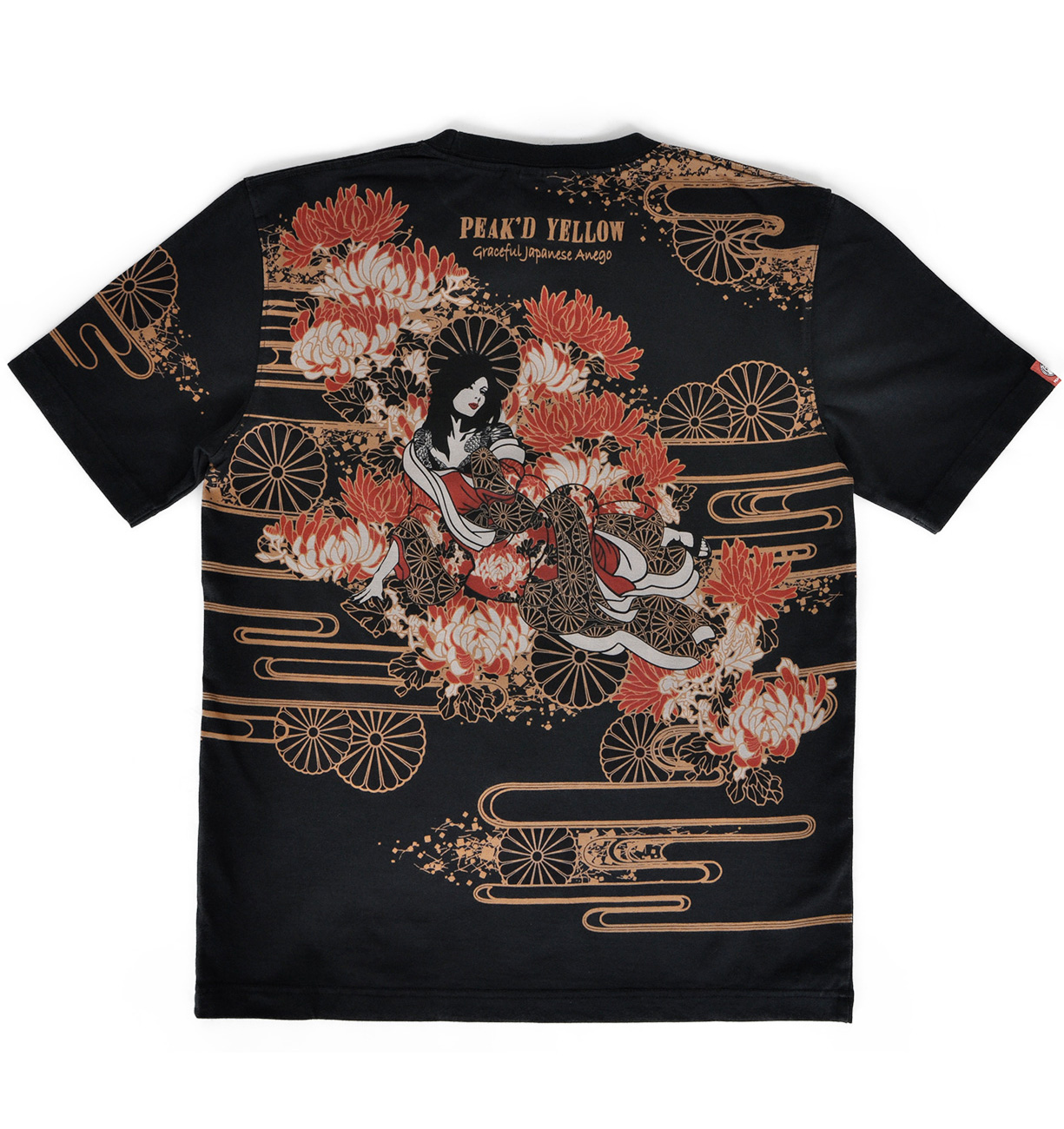 菊の花と菊の紋をバックに、そして同じ柄を落とし込んだ着物に身を包む姐御。はだけた肩にもよく見ると菊の紋が。優雅で妖艶なデザイン。