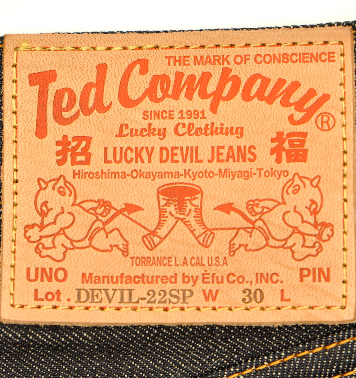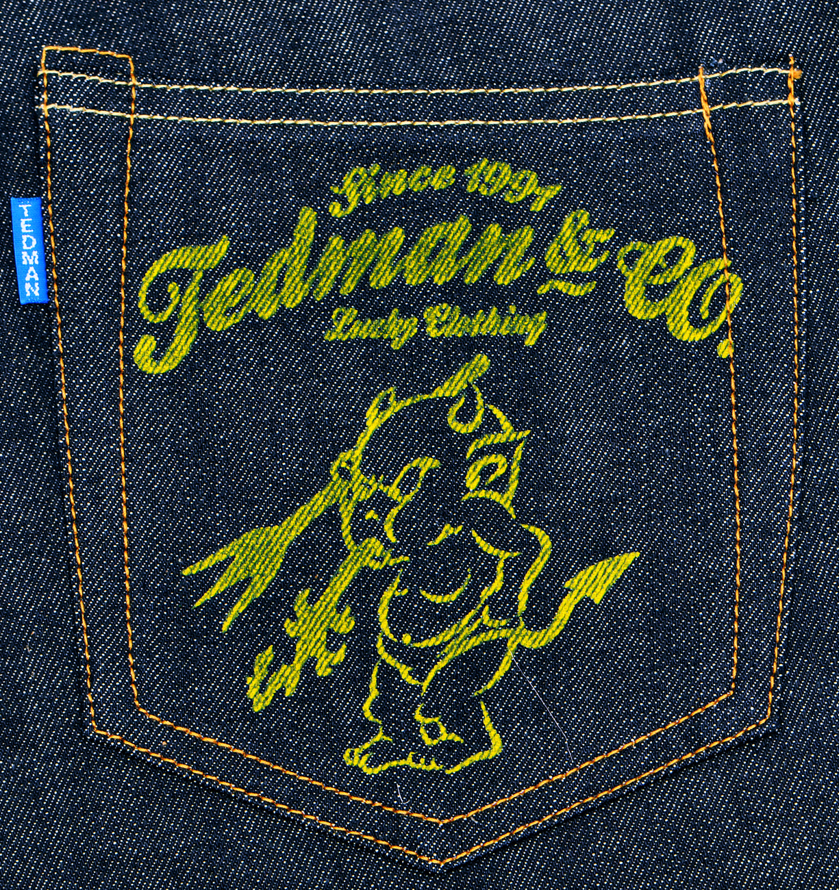 今回は、22周年記念リジッドデニムの登場です。 履き心地を最優先させて尚且つ、剛健さを兼ね備えるデニムを追求した答えが、レギュラーデニムよりやや軽めの13オンス。色も光沢を若干持たせた明るいインディゴブルー。もちろんセルビッチ・防縮加工も施されております。ヒップのプリントには拘りの抜染プリント加工で左ヒップに22周年、右ヒップにはテッドのロゴとキャラが入り独特の風合い、経年変化が楽しめます。 この夏、エフ商会が考える一つの完成形です。
