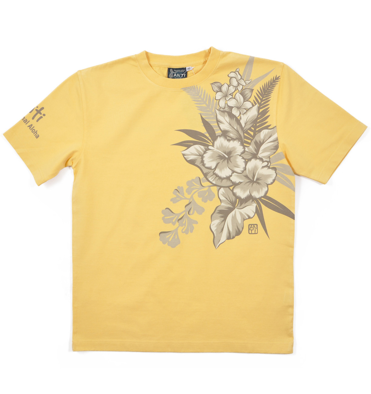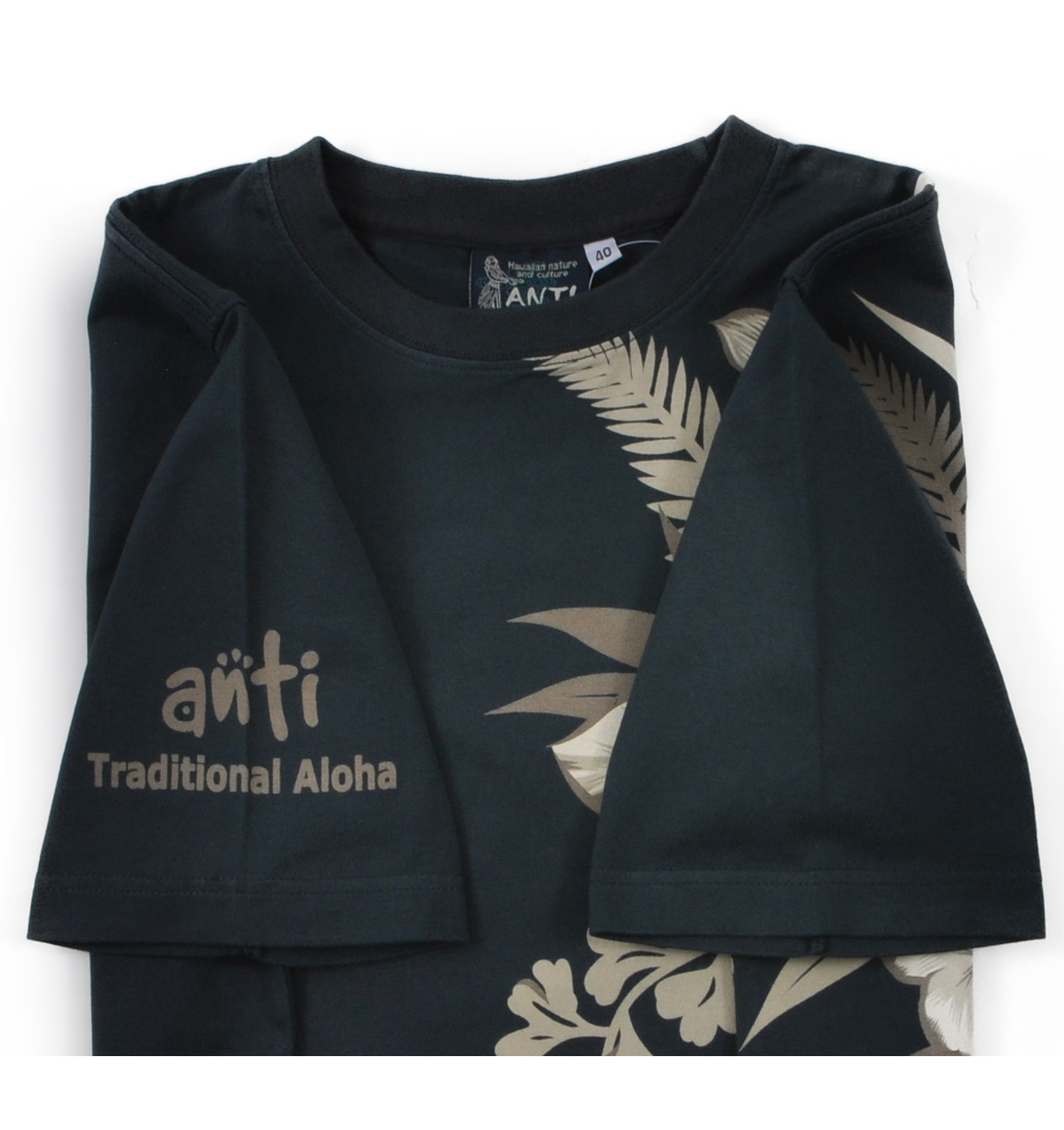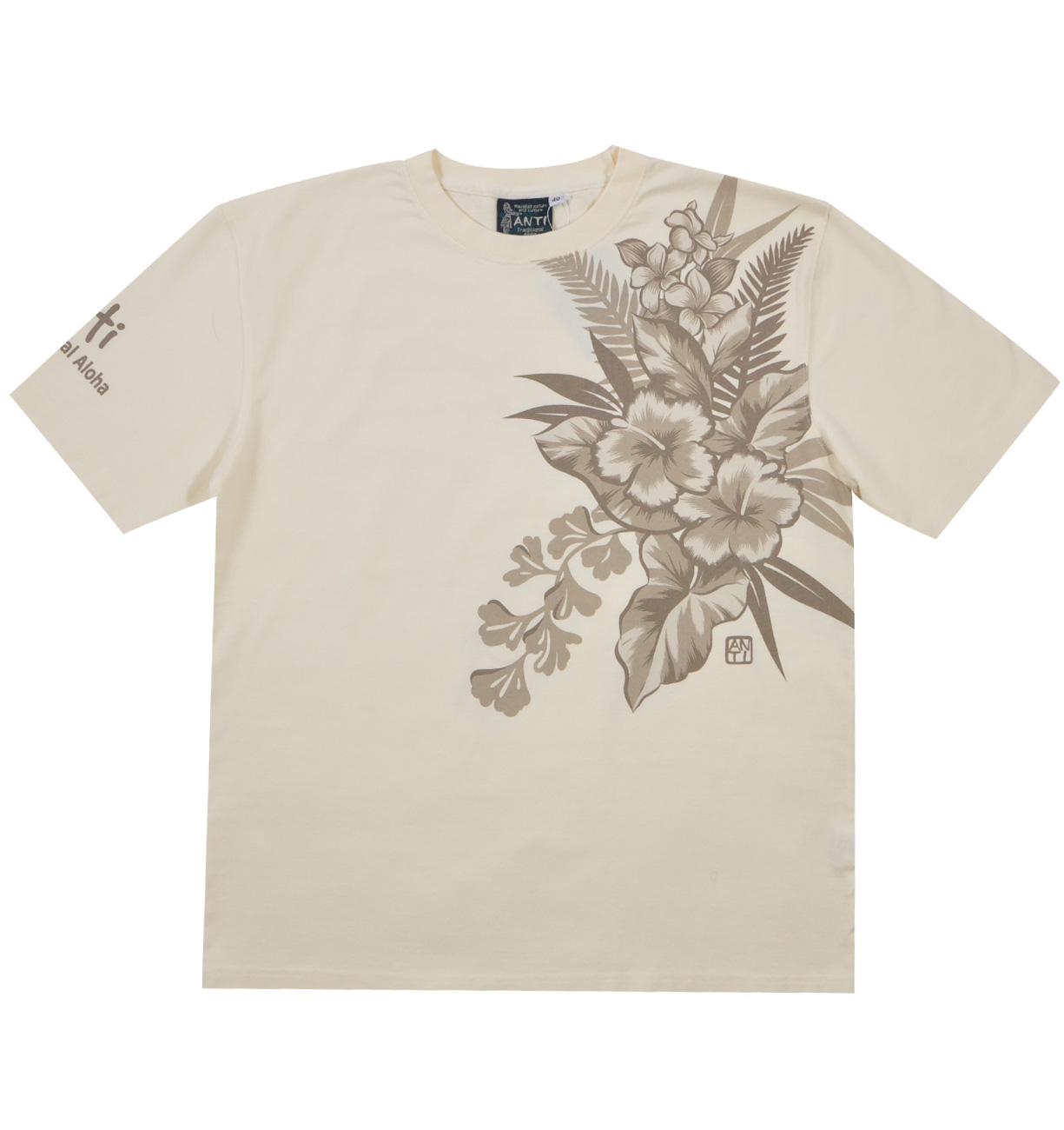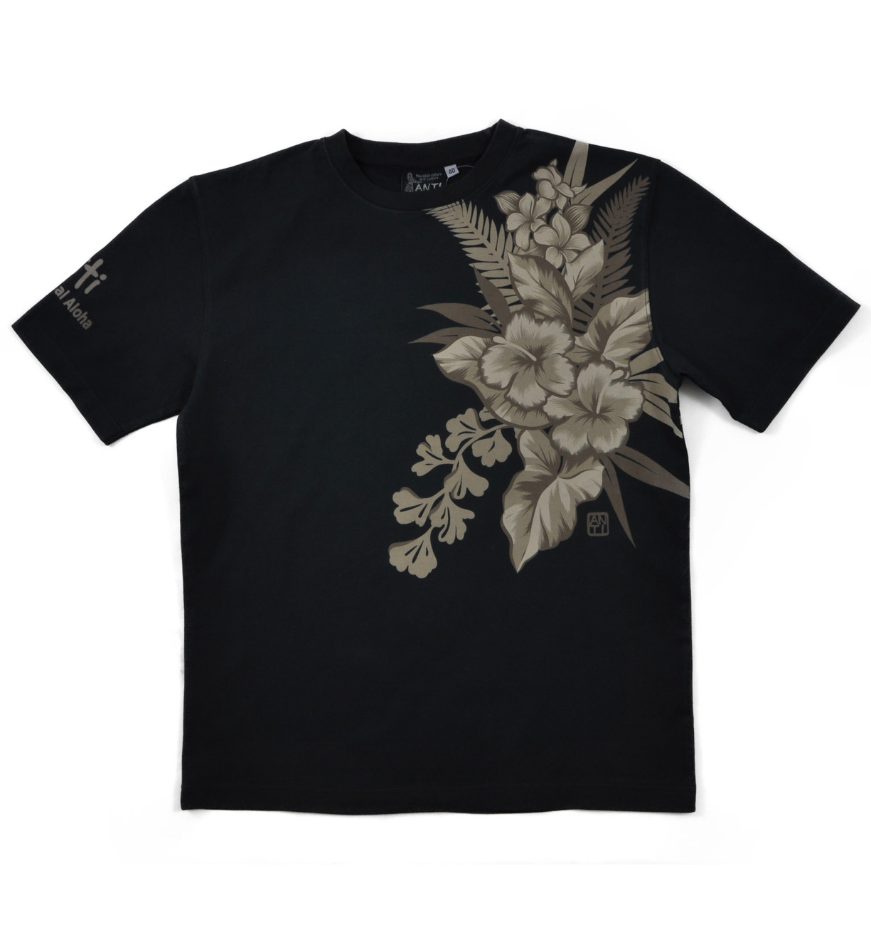 ハワイの花を配色を抑えてシックにまとめたデザイン。細かいグラフィックで抜染プリントの緻密さを堪能出来る一枚。