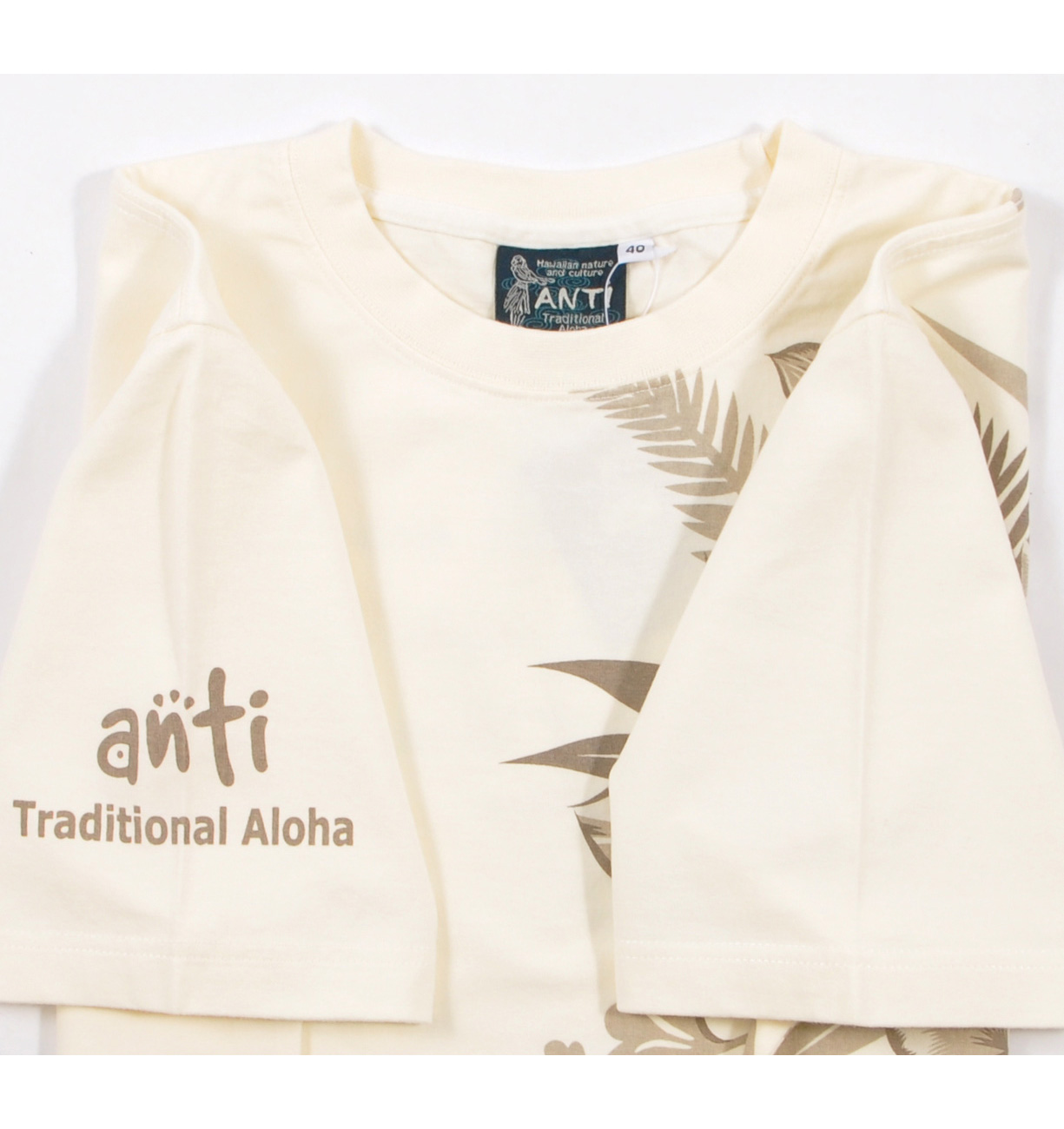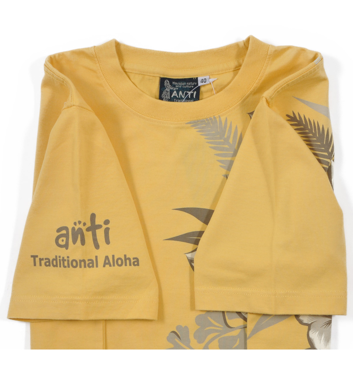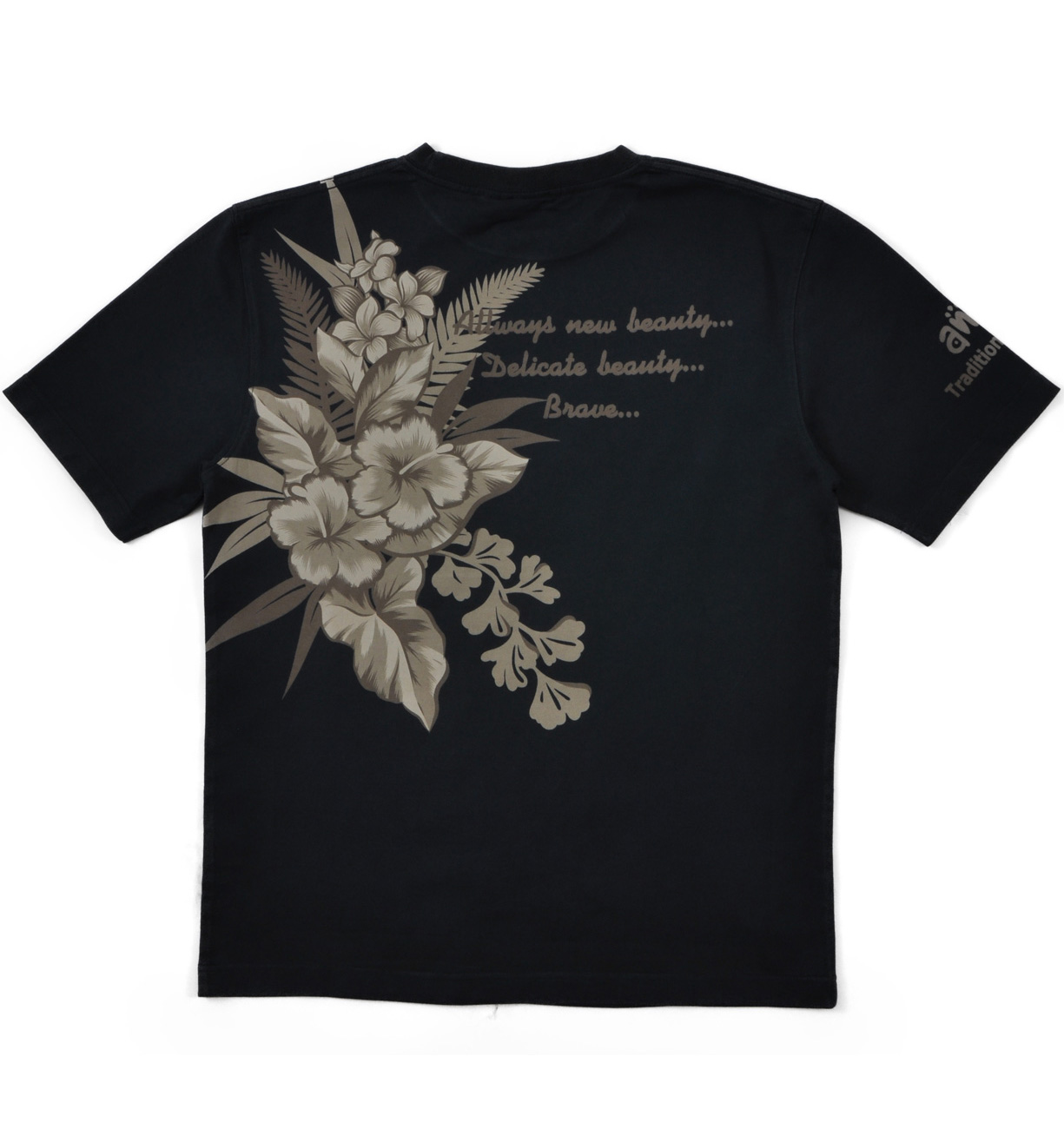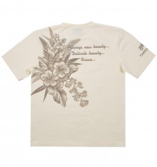 ハワイの花を配色を抑えてシックにまとめたデザイン。細かいグラフィックで抜染プリントの緻密さを堪能出来る一枚。