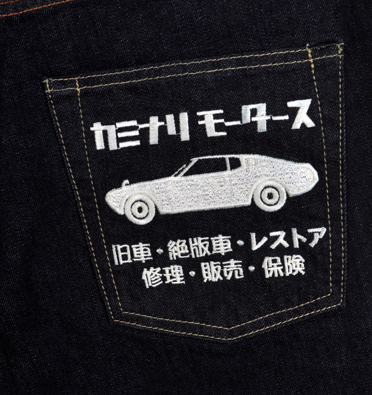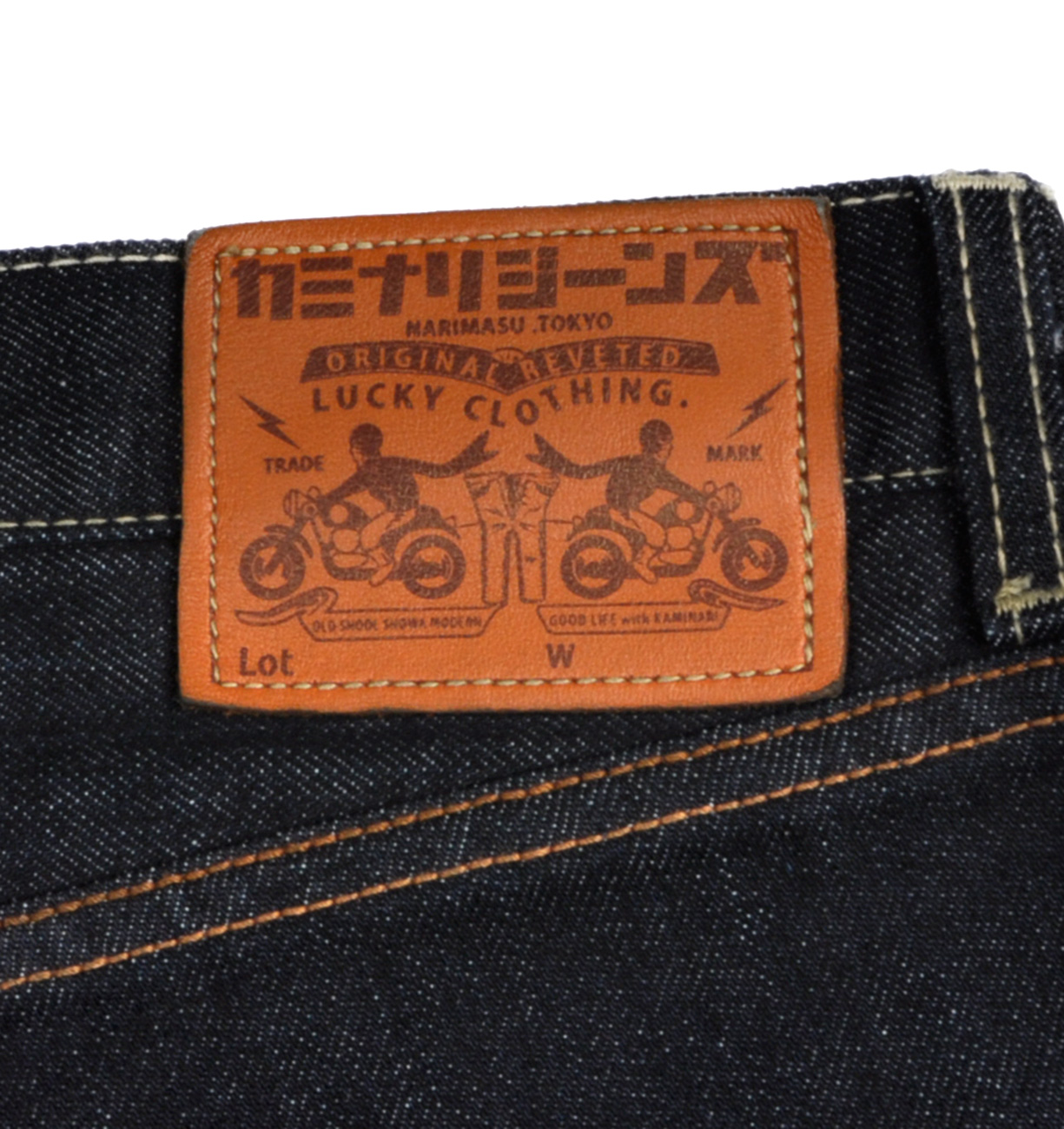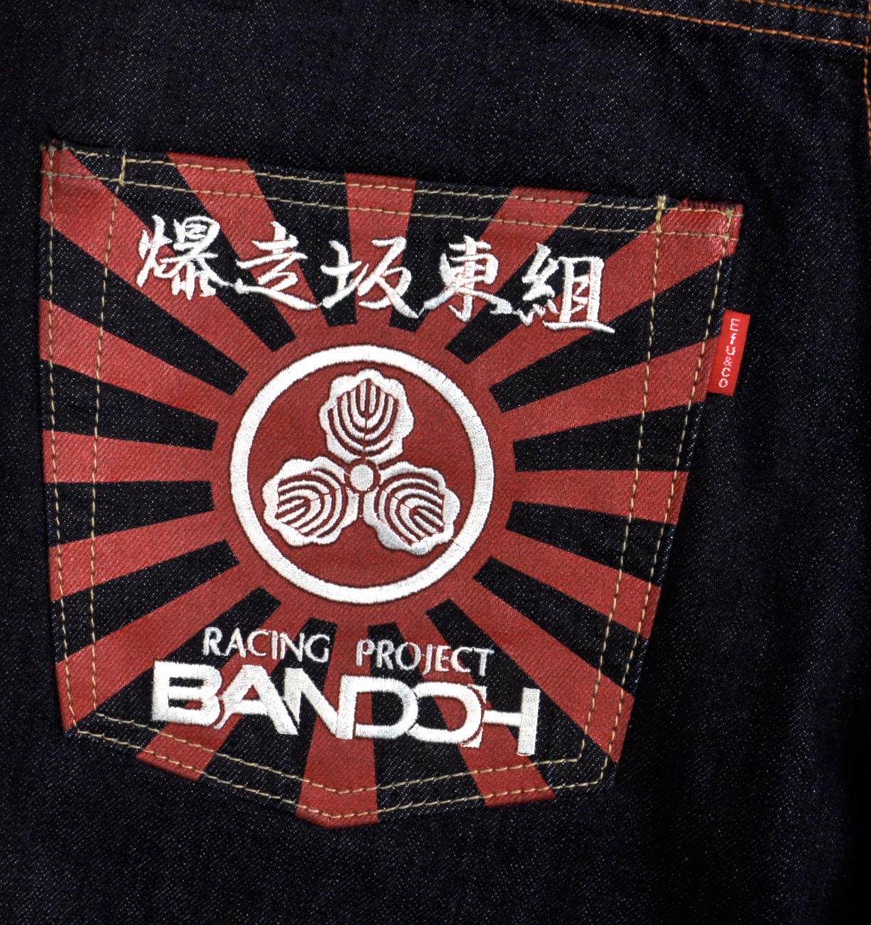 カミナリ 爆走坂東組 コラボ刺繍仕様が登場しました!左ポケットはレッドカラーのラバープリントの上にライトベージュの刺繍を重ねるという大変凝った造り、右ポケットは細部まで緻密な単色の刺繍です! 素材はシャリ感があり、よりビンテージ感のある13オンスデニム、オリジナルのドットボタン、リベット、革パッチなどの拘りの付属を使用し、ワンウォッシュ加工を施す事により、大変穿きやすく、穿き込む程経年変化が楽しめる秀逸な仕上がりとなっております。