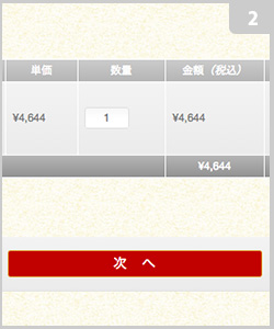 「カートへ入れる」をクリックすると、「買い物カゴ内商品一覧」のページに移動します。このページで、注文商品に間違いがないか確認したら、「次へ」をクリックします。