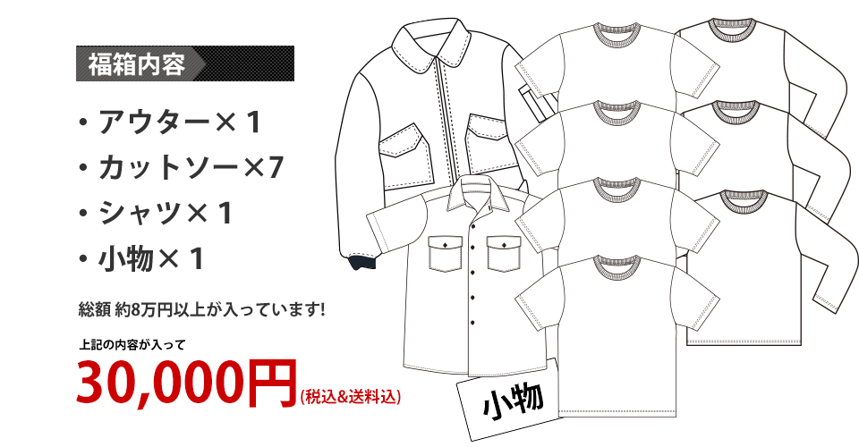 こっそり中身を教えちゃうと・・・アウターはミリタリー系ジャケット又はリバーシブルスカジャン!カットソーのアソートにシャツ系とコレクション小物!