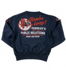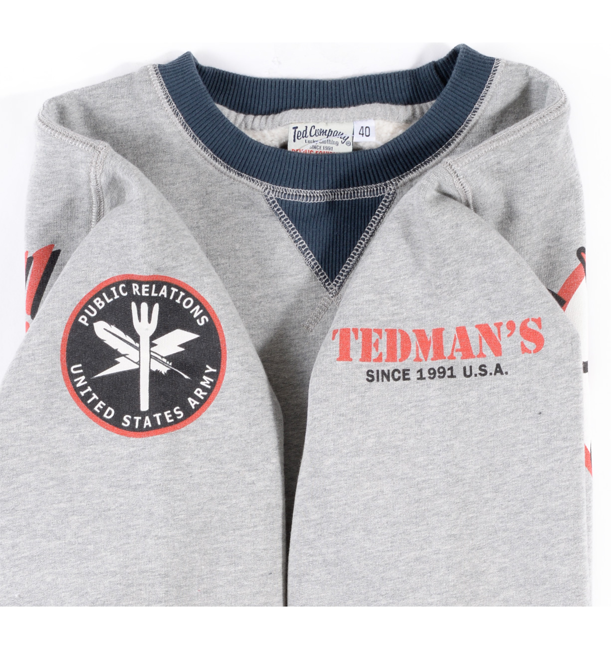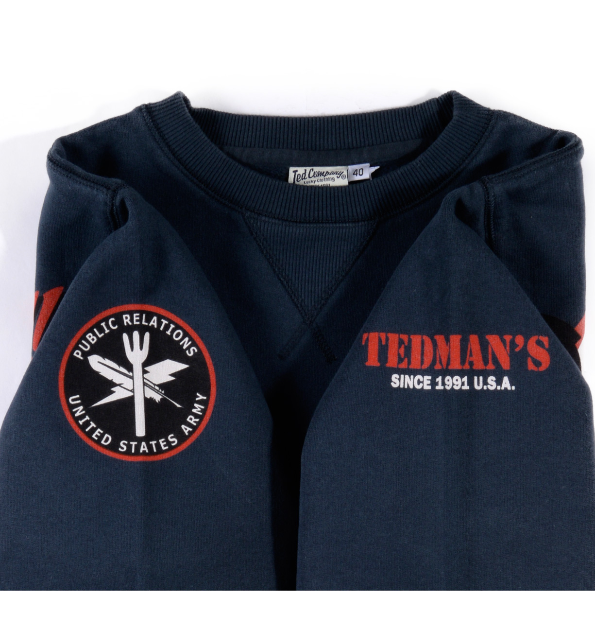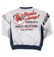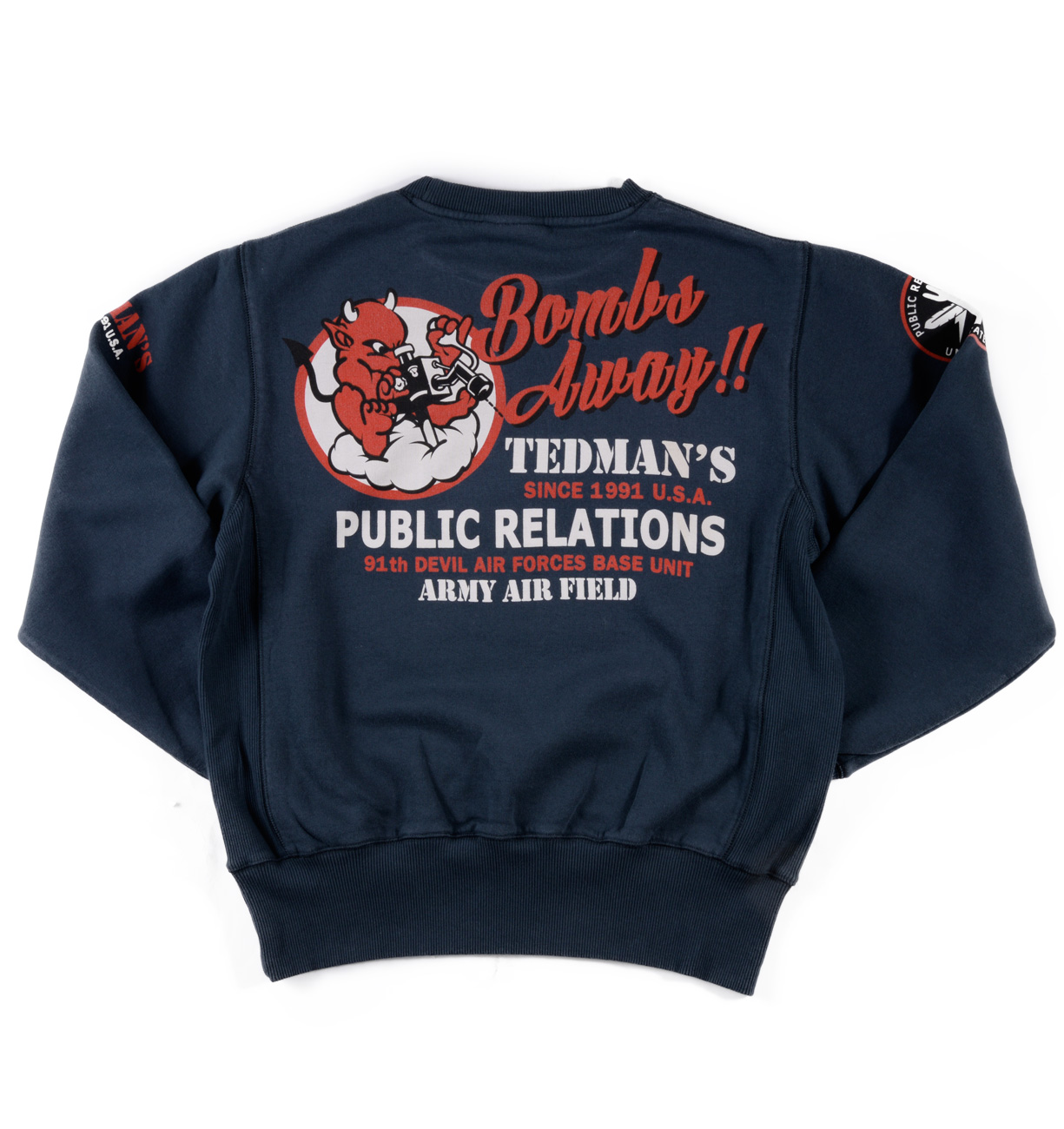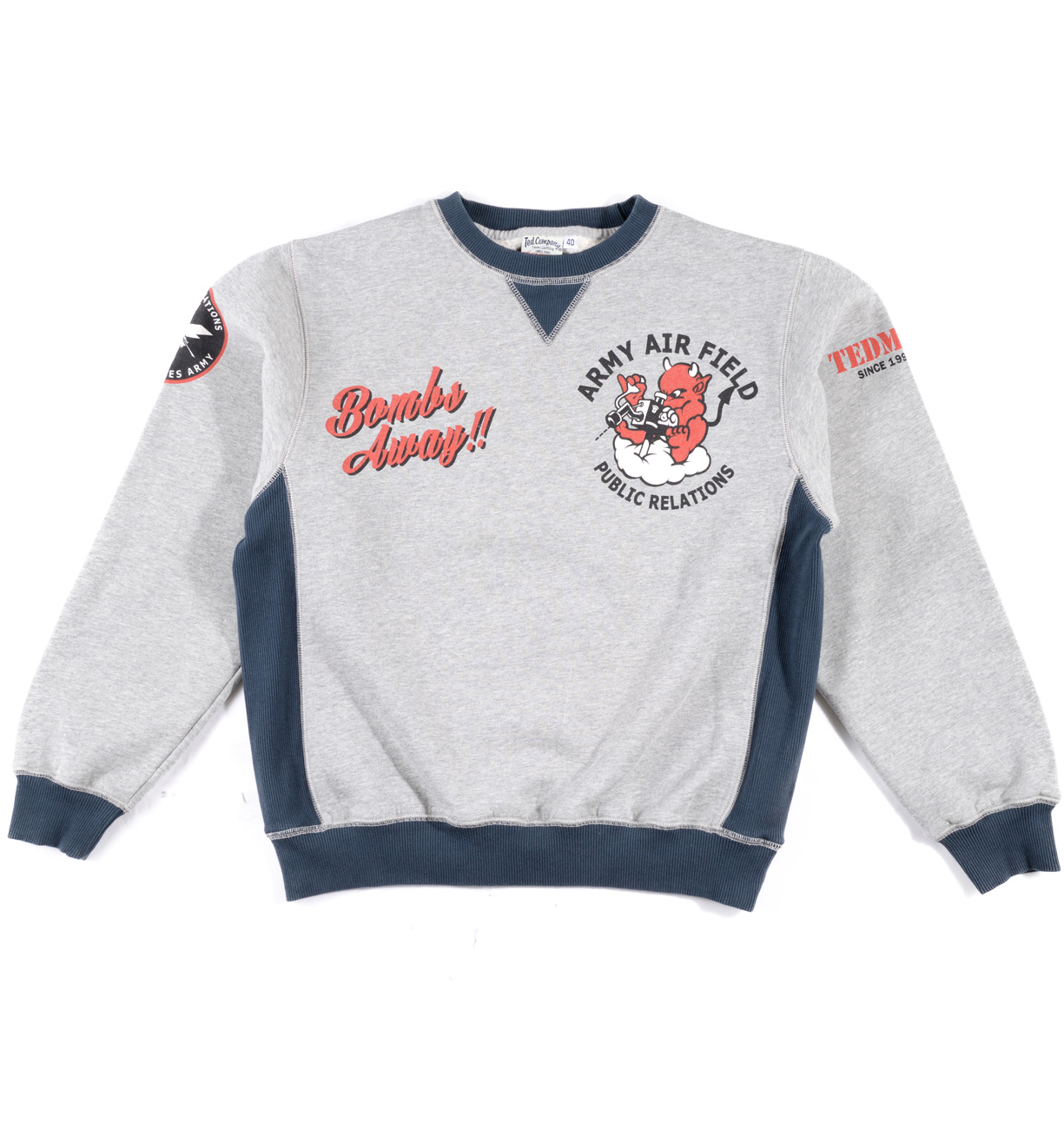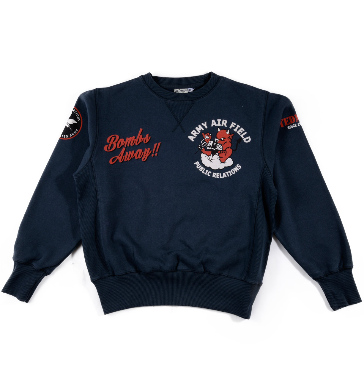Vガゼットや胴リブの切り替えしなど、ヴィンテージ・スウェットのディテールに拘った一着は裏起毛タイプとなり保温性も高い。採用生地はコットン100%のスウェット生地で、ウォッシュ加工により、こなれた感じも演出されている。モチーフは陸軍航空隊、91thデビルエアーフォース。所属のテッドマンが爆弾投下の機をうかがう図案が魅力のアイテムだ!